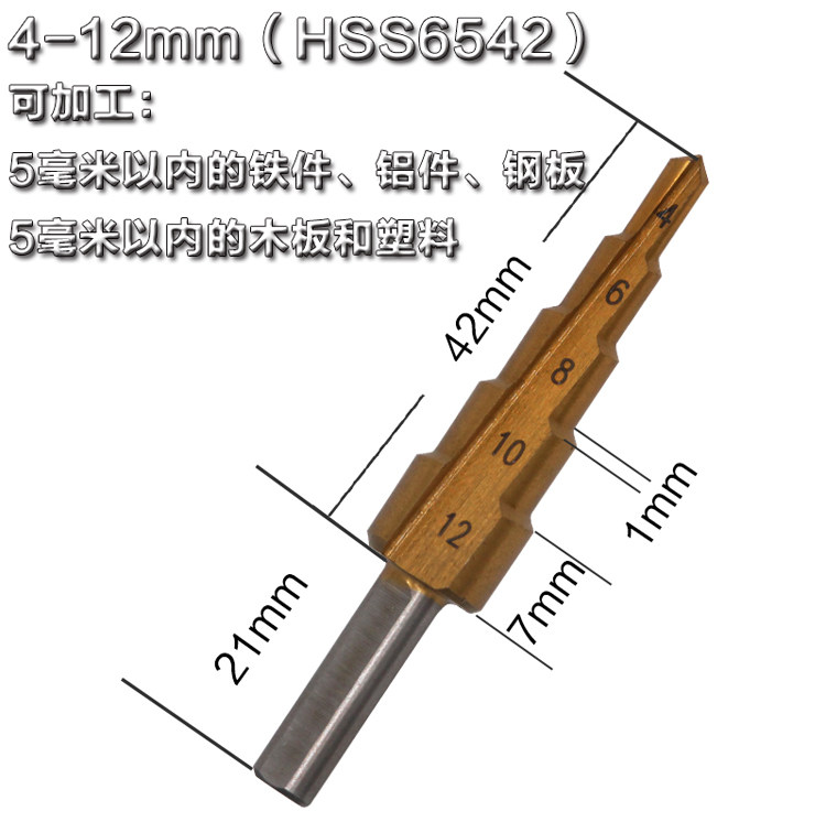 - 独特的阶梯构造,一只钻头能开多种规格尺寸孔径,一只阶梯钻抵上一盒钻头。