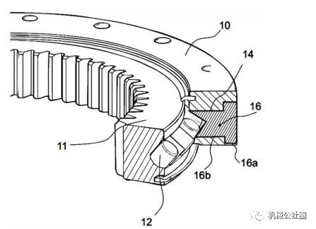 回转轴承的外环 10。除了外环 10 以外,回转轴承包括 内环和滚子 12,所述滚子布置在内环和外环 10 之间从而分别在内环和外环 10 的锥形滚道 上滚动。 通孔 14 设在外环 10 中并且具有使滚子 12 在装配时能够通过通孔 14 装配到外环 10 和内环之间的空间中的直径。此外,通孔 14 可用来将滚子 12 从轴承中取出,以便维护、 更换等。