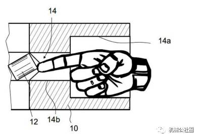 当滚道被加工时,塞子 16 被插入到通孔 14 中,从而使得塞子 16 的端面在装配构 造中形成滚道的一部分。如图 所示,塞子 16 包括具有较大直径的头部 16a 和具有较小直径的、与头部 16a 同心的内部 16a。如图 4 更具体所示,通孔 14 具有与塞子 16 的形状配合的构造并且具有较 小直径的内部 14a 和较大直径的外部 14b,其中外部 16b 形成为内部 16a 的沉孔并且与内部 16a 同心地布置。当装配工人用他的食指试图将滚子 12 推过通孔 14 时,它的无名指或者小姆指可 能与通孔 14 的边缘发生冲突,并且工人可能无法进一步向内推动滚子 12。滚子 12 可被向 内推进的深度基本上受到工人食指长度的限制,即大约 8cm。