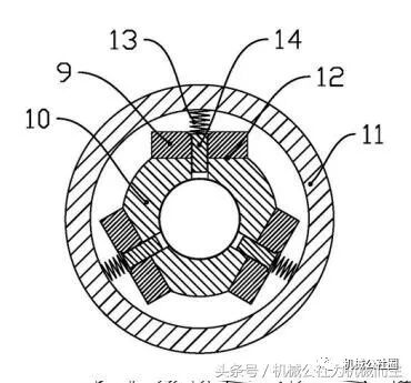如图3、图4和图5所示,每块挡片9和内管10之间均通过至少两个径向设置的导向 柱14相连,同一块挡片9上的导向柱14沿内管10的轴向间隔设置,压缩弹簧13径向设置且与 导向柱14一一对应,压缩弹簧13的外端与外管11的内壁相连、内端与导向柱14的相连,导向 柱14的外端具有能够与挡片9上的沉孔16卡合的凸出部15,导向柱14的设计能够使挡板的 活动始终都是沿着径向的,不会发生偏移,