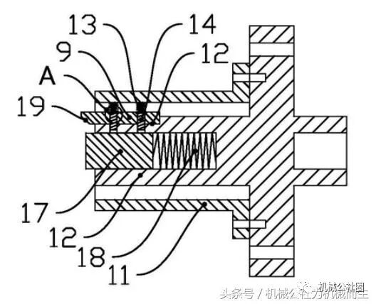 有助于提高本螺纹磨床的稳定性,即使长时间的 工作,挡片9的位置也不会发生偏移,避免了因为偏移而产生的松动,进一步提高对螺纹刀 片固定的牢固度。内管10内设置有能够沿着内管10内壁在轴向滑动的退料件17,退料件17 的左侧固连的复位弹簧18能够将退料件17向右推使退料件17的右端从内管10的右侧伸出, 退料件17的设计能够在螺纹刀片加工完成后顶尖7右移时,自动将夹持在三个挡片9内的螺 纹刀片推出,完成退料,结构简单,无需额外操作,