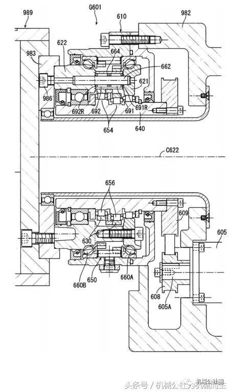 小径中空部40P1及大径中空部40P2形成为均与 曲轴40的轴心C40平行。本齿轮装置G1的外壳10由与所述内齿轮主体50A一体化的第1外壳体11、配置在该 第1外壳体11的轴向上的与动力输入侧相反的一侧的第2外壳体12及配置在第1外壳体11的 轴向上的动力输入侧的第3外壳体13构成。第1外壳体11位于外齿轮30的径向外侧,并且如前述兼作内齿轮50的内齿轮主体 50A。第2外壳体12形成为环状且在内周形成有所述主轴承60的滚动面60B。