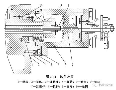 图3-61为一种卸荷装结构,油缸6与连接座3固定在一起,solidworks教程网gocae.com 但是连接座3由螺钉5通过弹簧压紧在箱体2的端面上.连接座3与箱孔为滑动配合。当油虹的右端通入高压油使活塞杆7向左推压拉杆8并压缩碟形弹簧的同时.油缸的右端面也同时承受相同的液压力.故此时,整个油缸连同连接座3压缩弹摘4而向右移动,使连接座3上的垫圈10的右端面与主轴上的螺母1的左端面压紧.因此,松开刀柄时对碟形弹簧的液压力就成了在活塞杆7、油缸6、连接座3、垫圈10,螺母1,碟形弹簧、套环9、拉杆8之间的内力.因而使主轴支承不致承受液压推力。文章源自solidworks教程网-http://gocae.com/3671.html