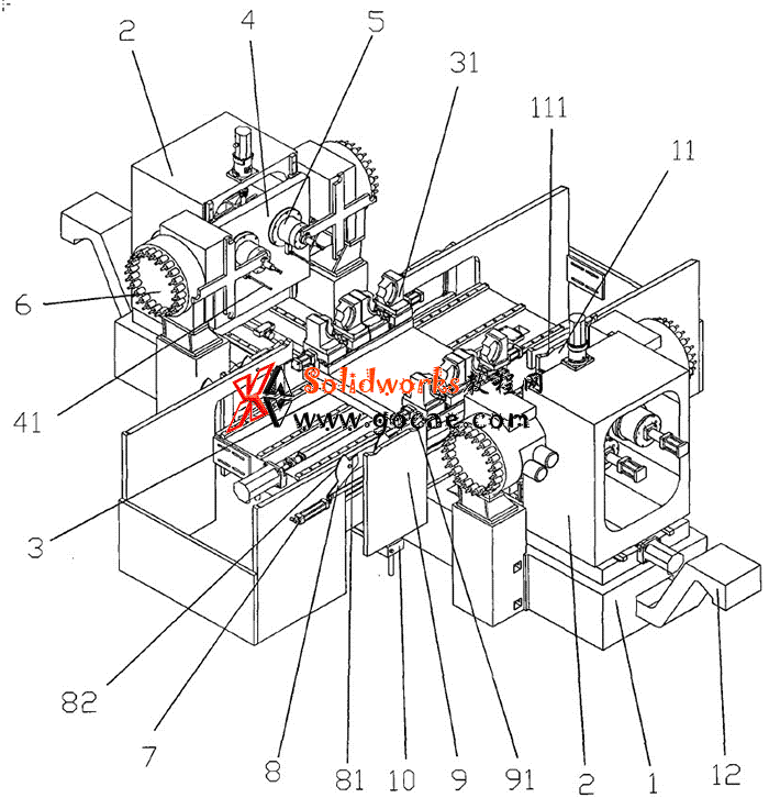 参照图1〜图4,本实用新型的一种对列主轴卧式加工中心,包括床身1,所述床身 1上X轴方向的两侧对称设置有可在Z轴方向滑动的立柱2,所述两侧的立柱2之间设有可 在床身1的X轴方向滑动的X向滑板3,所述立柱2朝向X向滑板3的一侧设有可沿其上下 滑动的主轴箱5,所述主轴箱5上装有一个或两个主轴51,所述立柱2的侧面设有刀库6,与 所述主轴51 对应。文章源自solidworks教程网-http://gocae.com/3730.html